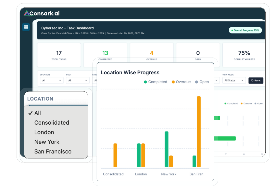 Consark gives you multi-tenant governance, prebuilt close frameworks, and ROI visibility — so you deliver value faster across clients. What you can do • Onboard clients rapidly using best-practice templates • Standardize controls & close across engagements • Track and report ROI improvements for boards • Manage multiple clients from a single console