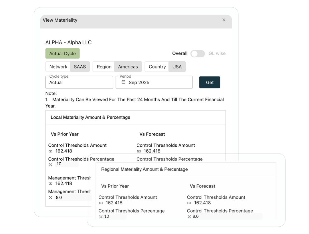 Set thresholds at the GL, entity, or organizational level. AI preparers use them to decide what surfaces and what stays silent.